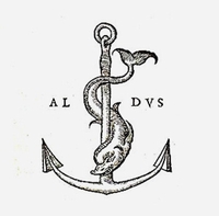 Op het vignet van Manutius (1449-1515) wordt dit weergegeven door een dolfijn en het anker (snelheid en vertraging)